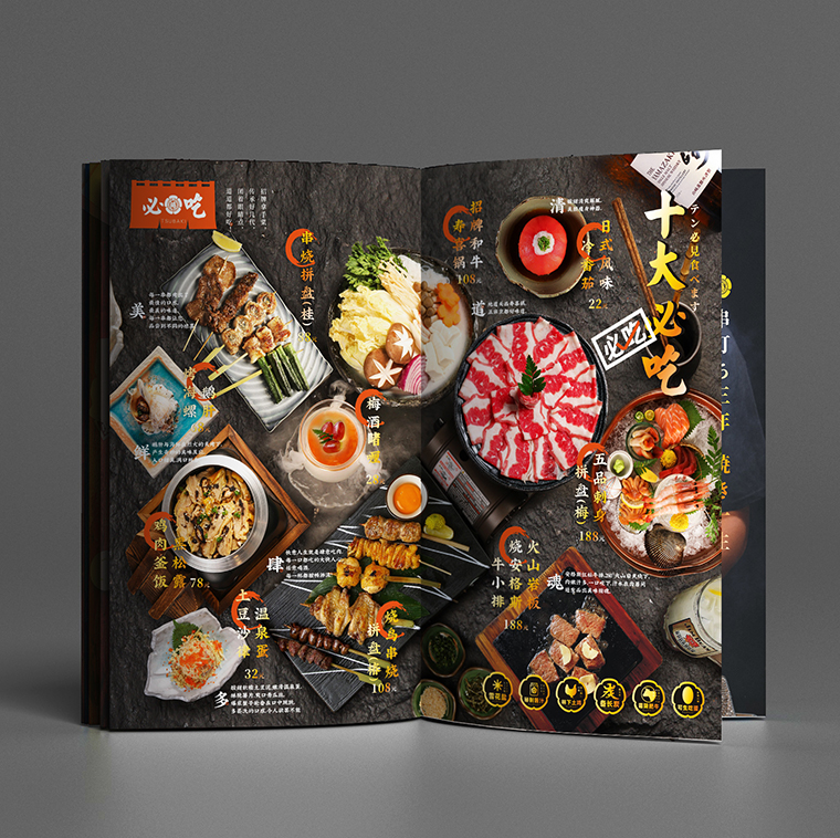 重點(diǎn)主推菜品,有文案引導(dǎo)說(shuō)明,菜品話術(shù)闡述,圖片占據(jù)整個(gè)版面50%以上,讓消費(fèi)者一眼就看到;對(duì)次推菜品直接用色塊菜名文字區(qū)分;菜譜中的文字字體主推菜品使用金色漸變處理,是從燒鳥(niǎo)中火焰顏色演變而來(lái)。