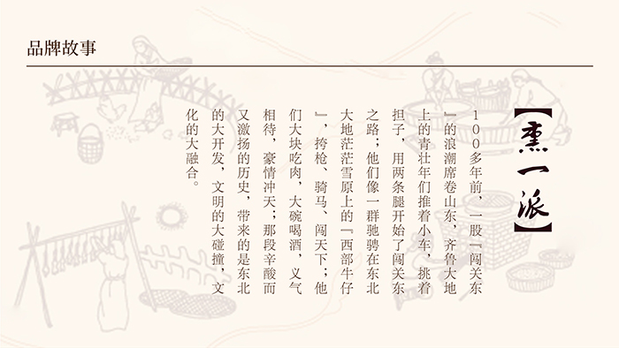 品牌故事將熏一派的由來(lái)交代的非常清楚,而且故事發(fā)生在闖關(guān)東的歷史背景下,富有傳奇色彩。圍繞這品牌故事,我們提取了熏一派的核心訴求:世代傳承,匠心入味。