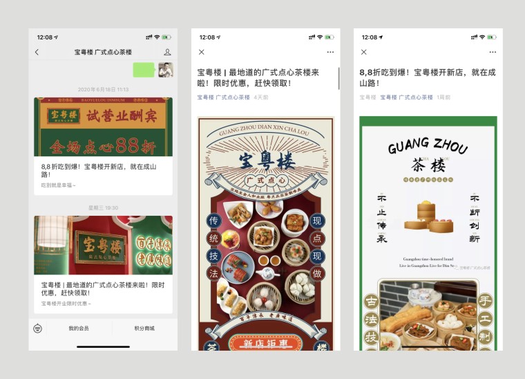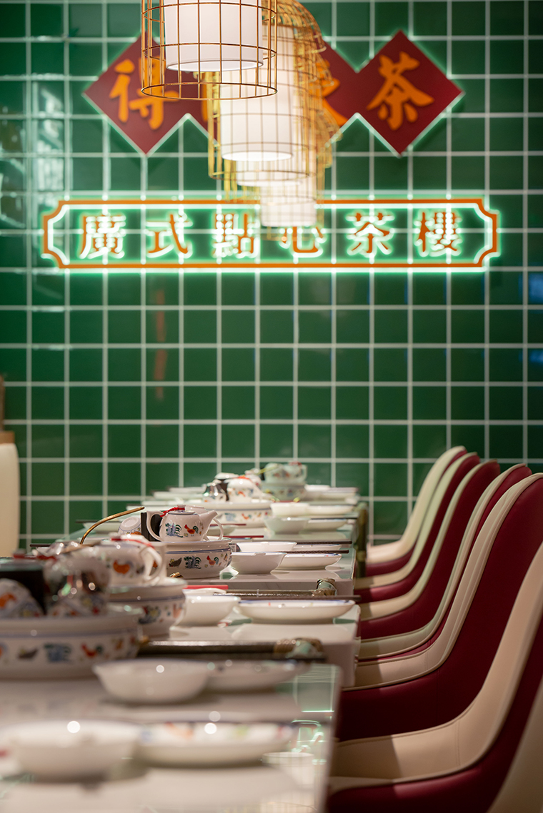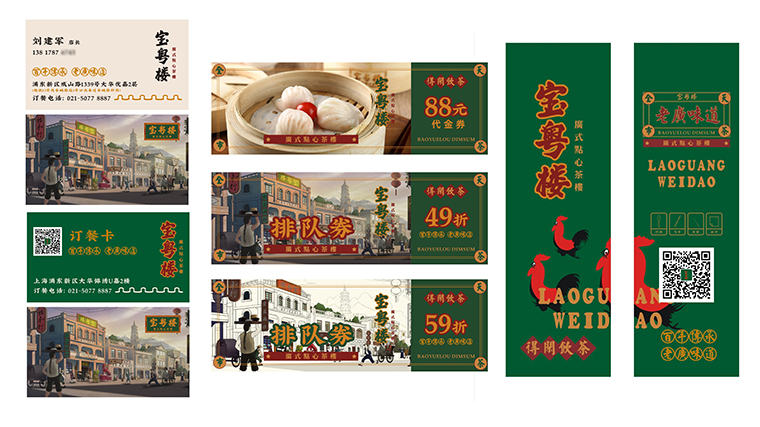 其他的VI如店內日常運營的物料系統,導視系統,推廣廣告系統,品深餐飲設計團隊力圖整體空間與品牌完整統一,精細到連顧客接觸最多的墊餐紙、點餐單、使用的功夫茶具、員工的工衣胸牌、圖片的風格,全部統一在寶粵樓的品牌文化體系之內,給顧客以視覺整齊劃一又靚麗多變的美學感受。