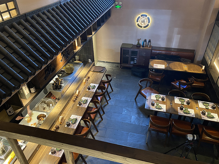 2、一樓大廳及吊頂?shù)脑O(shè)計(jì):把京都的古老街道,巷子搬到我們店里。整個(gè)大廳的頂部環(huán)繞一圈日式黑瓦頂,四周幾個(gè)日式玻璃木窗,與地面的青石瓦面,墻體的稻草漆,燒烤吧臺(tái)形成一體化的京都風(fēng)格。置身其中,仿佛