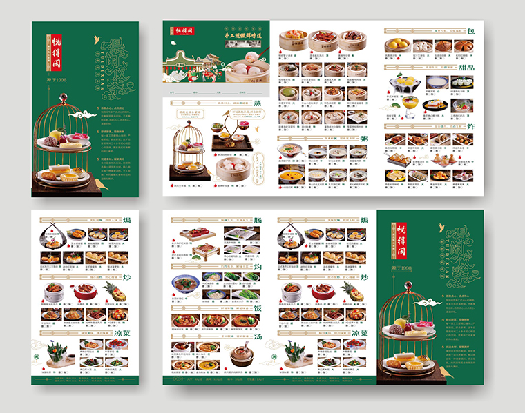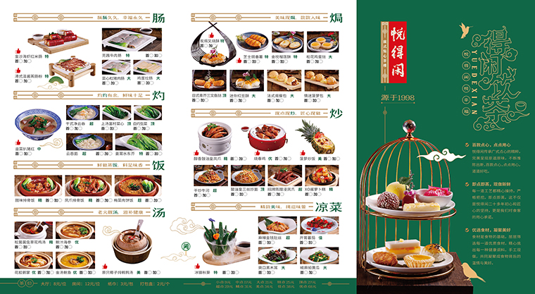 菜單價格避免使用常規(guī)排版版式,盡量弱化代替,將價格數字縮小,金錢標志¥20簡化為20.價格后面標明菜品的單位。價格代替,例如品深設計做的悅得閑、寶粵樓、蘩樓等廣式點心的菜單,都不放價格,用小點、大點、中點、特點、頂點、超點、精點、佳點、優(yōu)點來代替。在底部統(tǒng)一將小點、大點、中點、特點、頂點、超點、精點、佳點、優(yōu)點標上價格。菜品與價格隔離就會減少價格對顧客的影響,不經意間放大了顧客的消費金額。