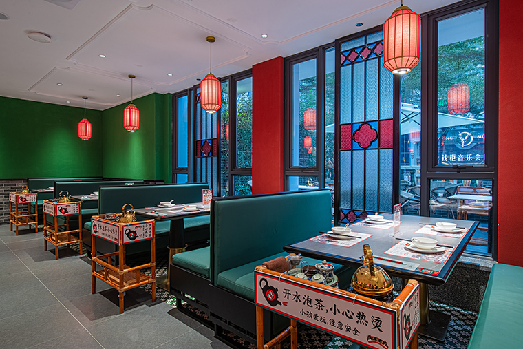 1、用品牌強關聯(lián)的具體一個元素串聯(lián)整個裝飾,形成品牌專屬識別記憶。空間中我們使用了滿洲窗,用滿洲花窗串聯(lián)整個門店,與品牌傳達的西關老號,五代傳承高度貼合,拍照打卡效果很好,老茶樓的氛圍感迅速出來了。
