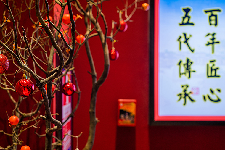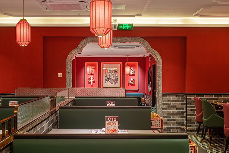 復古紅比鮮紅要暗一些,厚重些,鮮紅是新鮮食材的顏色,表達我們的核心產(chǎn)品賣點,新鮮現(xiàn)做;紅色也是喜慶熱鬧的氛圍表達,可以很好傳達粵點茶樓熱鬧、街坊四鄰飲茶打招呼的場景;